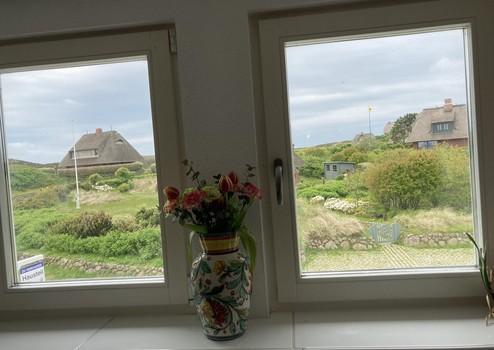 Der Blick nach Süden über Garten, Heide, Dünen, Blidsel Bucht , Wattenmeer liefert Motive für Fotobücher. Der private Süd-Garten mit Rosenhecke bietet