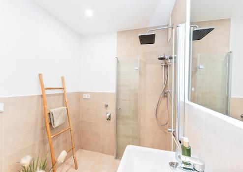- Bodengleiche Dusche mit Glasabtrennung und Regendusche