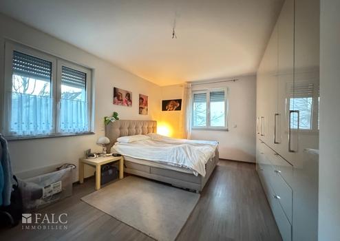 Das großzügige Schlafzimmer bietet durch seinen durchdachten Schnitt reichlich Platz für ein großes Bett, Kleiderschränke und weitere Möbelstücke. Die ruhige, harmonische Gestaltung des Raumes sorgt für erholsame Nächte und ein angenehmes Wohngefühl.