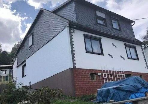 Die spezielle Außenfassade besteht zum Teil aus Fliesen, Putz und Naturschiefern. Das Dach des Objekts ist mit Naturschiefern und Bitumenschweißbahn gedeckt. Das Einfamilienhaus wird mit einer Gas-Zentralheizung geheizt. Ein funktionsfähiger Kachelofen, der beide Etagen beheizt, ist ebenfalls vorhanden. Im Haus sind teilweise doppelte Holzfenster und teilweise Kunststofffenster mit Rollläden verbaut.