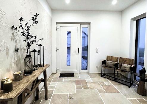 Das Haus ist ökologisch und energieeffizient konzipiert – mit Wärmepumpe, wohngesunden Materialien wie Echtholzböden und Naturstein sowie großzügigen Fensterflächen für ein helles und ausgewogenes Wohnklima.