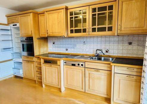 Eine hochwertige Einbauküche mit Echtholzfront und Miele-Einbaugeräten, sowie eine Eckvitrine ist beinhaltet.
