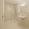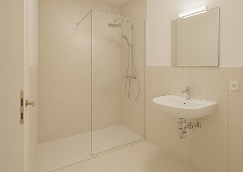 Das Badezimmer wurde frisch saniert und mit edlen Materialien ausgestattet. Hier finden Sie eine großzügige, bodengleiche Dusche mit Echtglasabtrennung, moderne Armaturen und geschmackvoll ausgewählte Fliesen in Naturtönen. Zusätzlich steht Ihnen ein separates Gäste-WC zur Verfügung – ideal, wenn Besuch kommt oder Sie Berufliches und Privates räumlich trennen möchten.