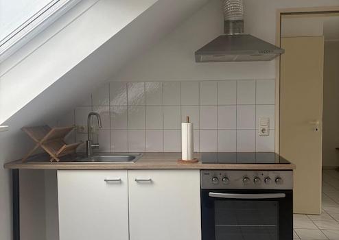 Das ein Zimmer Dachgeschoss Appartement mit Dachfenstern befindet sich im 3. OG in Augsburg Oberhausen. Im Appartement neuwertige voll ausgestattete Küche mit viel Platz für eine Tisch-Sitzecke.