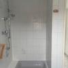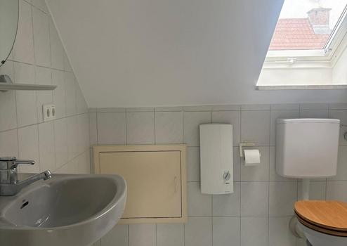 Das Bad ist hell gefliest mit Dachfenster, Duschkabine, Waschbecken und WC.