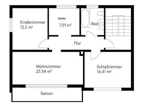 Beide Wohneinheiten verfügen über denselben Grundriss – jeweils mit großem Wohnzimmer, Balkon, Schlafzimmer, Kinderzimmer/Büro, Küche und Bad. Ideal geeignet für eine Familie, die gemeinsam, aber getrennt wohnen möchte.
