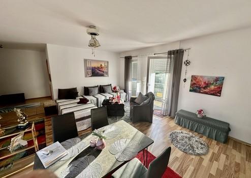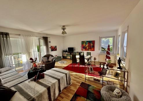 Von dem hellen Wohnzimmer gelangen Sie auf den westlich gelegenen Balkon.