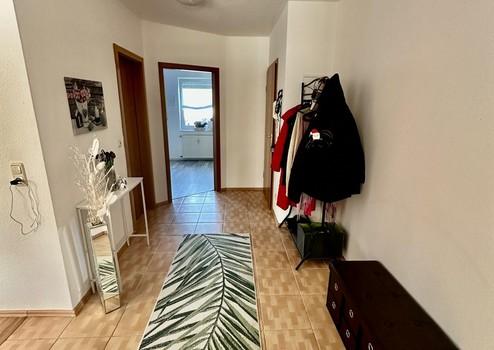 Sie treten durch die Eingangstür in die geräumige Diele ein und erreichen von dort jedes Zimmer. Rechts gelangen Sie ins Schlafzimmer. Das Bad, u. a. mit einer Badewanne ausgestattet, ist hell und freundlich durch das integrierte Fenster.