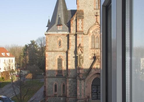 Die Wohnung orientiert sich mit ihrer Wohnseite zum ruhigen Innenhof -Atrium der Anlage -einer ehemaligen Stadtfabrik- im 2. OG. Von der Wohnküche geht der Blick zum Kirchplatz.