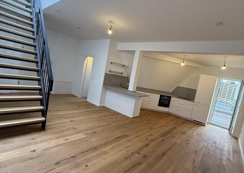 Herzstück der Wohnung ist das großzügige, lichtdurchflutete Wohnzimmer mit integrierter, voll ausgestatteter Wohnküche. Der offene Grundriss, die hohen Decken sowie die großen Fenster schaffen ein modernes und sehr angenehmes Wohngefühl. Vom Wohnbereich aus gelangen Sie direkt auf eine der beiden Terrassen.