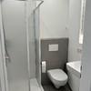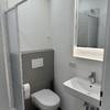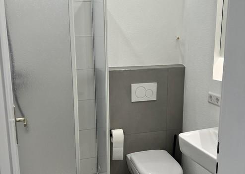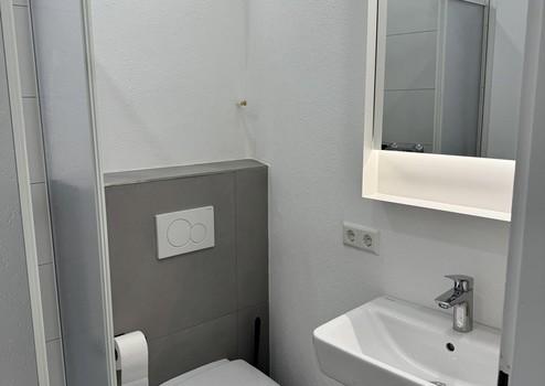 Das neue Bad glänzt mit einer Dusche, Waschbecken, WC und beleuchtetem Spiegel.