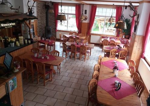 Der Hauptgastraum - im Gebäudeteil (II.) - umfasst ca. 45 Plätze. Hier ist ein Kamin vorhanden. (Halboffen) angrenzend liegt der Nebengastraum - im Gebäudeteil (I.) - mit weiteren 20 Plätzen. Daneben liegt dann der Aufenthaltsraum, der entweder eben als solcher oder aber als Erweiterung des Restaurants (ca. +20 Personen via Verbindungstür) oder gut als Buffetstandort bei Feierlichkeiten dienen kann.