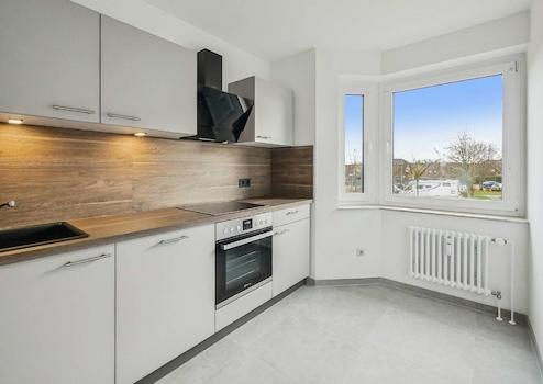 Beim Betreten dieser charmanten 2-Zimmer-Wohnung mit einer Wohnfläche von 55,75 m² werden Sie von einem einladenden Flur empfangen, der Sie direkt in die verschiedenen Bereiche der Wohnung führt. Rechts befindet sich die moderne Küche, die mit ihren hellen Fronten und einem großzügigen Fenster viel Tageslicht bietet. Hier können Sie Ihre kulinarischen Fähigkeiten entfalten und den Blick nach draußen genießen.