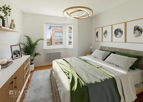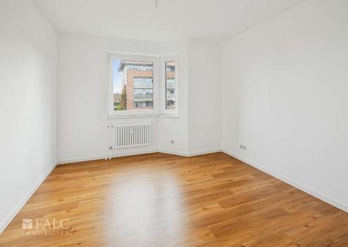 Das Schlafzimmer bietet genügend Raum für ein großes Bett und einen Kleiderschrank. Auch hier sorgen die Fenster für viel Licht und eine angenehme Wohnatmosphäre.