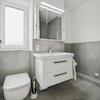 Das Badezimmer ist modern gestaltet und mit einer Dusche ausgestattet. Die neutralen Fliesen und die hochwertige Ausstattung schaffen ein elegantes Ambiente, in dem Sie sich wohlfühlen können.