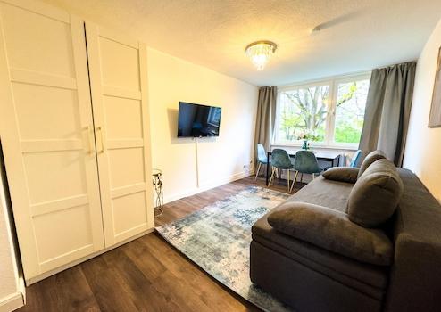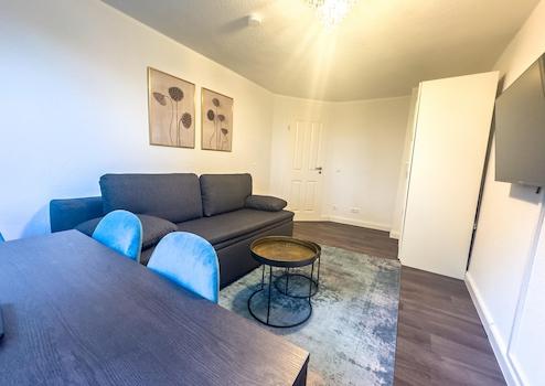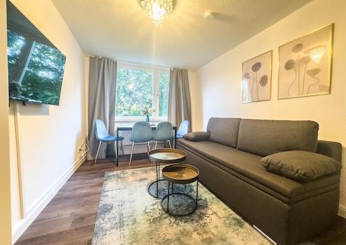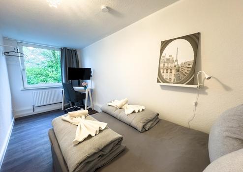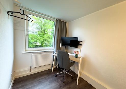 Die Wohnung ist voll möbliert und bietet alles, was man für einen komfortablen Einzug benötigt – ganz ohne Aufwand. Jedes Zimmer ist mit einem Bett, Smart-TV, Schreibtisch, Bürostuhl, Nachttisch, Beleuchtung sowie einem Kleiderschrank ausgestattet.