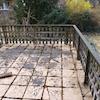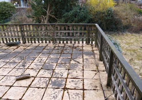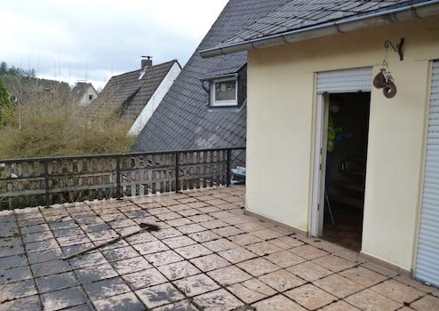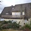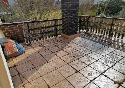 In der Diele der Erweiterung ist im Bereich hinter der Hauseingangstür ein deutlicher Wasserschaden an der Abkastung zu erkennen. Weitere Feuchtigkeitseinträge zeichnen sich im Bereich des eingeschossigen Wohnzimmer/Wintergarten ab. Zusätzlich weist dieser außen Risse und Abplatzungen an der Fassade und der Dachkante auf, z. T. liegt Bewehrung frei.
