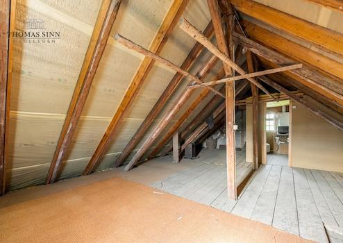 Über die Dachboden-Einschubtreppe gelangt man in den geräumigen Spitzboden mit Aufstellort der Gas-Brennwerttherme und großem Potenzial für weiteren Wohnraum. Im Zuge einer Dachsanierung ließe sich hier mittels Dachgaupen und Dachfenstern, sowie einer Erweiterung des Treppenhaueses, ein helles Studiozimmer realisieren.