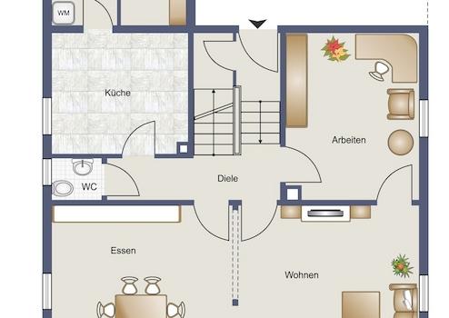 Hier befindet sich ein helles nach Osten ausgerichtetes Arbeits-/oder Gästezimmer mit Verbindungstür zum großzügigen, nach Süd-/West ausgerichteten Wohn-/Esszimmer mit wunderschönem Blick auf den Garten. Im nördlichen Bereich des Hochparterres befindet sich die separate Küche mit angrenzendem Hauswirtschaftsraum.