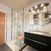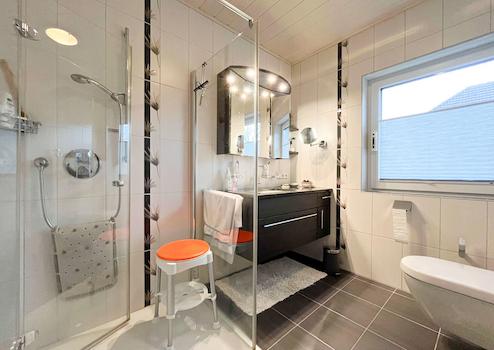 Willkommen in Ihrem privaten Rückzugsort – dem Badezimmer, das durch seine zeitgemäße Gestaltung und hochwertige Ausstattung besticht. Die große, ebenerdige Dusche bildet den Mittelpunkt dieses Raums und verspricht ein luxuriöses Duscherlebnis. Der Komfort wird durch den Handtuchwärmekörper erhöht, der nicht nur für wohlige Wärme sorgt, sondern auch die Handtücher griffbereit hält. Der Badezimmerunterschrank mit integriertem Handwaschbecken vereint Funktionalität und Ästhetik. Die eleganten Oberflächen und die klaren Linien des Unterschranks schaffen nicht nur Stauraum für Ihre persönlichen Pflegeprodukte, sondern verleihen dem Raum auch eine moderne Note. Ein moderner Spiegelschrank bietet nicht nur zusätzlichen Stauraum, sondern setzt auch ein stilvolles Statement. Mit integrierter Beleuchtung schafft er eine angenehme Atmosphäre und erleichtert die tägliche Pflege.