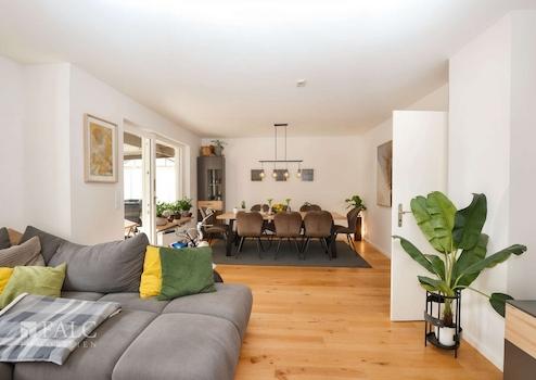 Das Herzstück des Hauses ist der lichtdurchflutete Wohnbereich mit großen Fensterfronten. Vom Wohnzimmer aus gelangen Sie direkt auf die überdachte Terrasse und in den Garten – ideal für entspannte Stunden im Freien oder gesellige Abende mit Familie und Freunden. Der angrenzende Essbereich schafft eine offene, kommunikative Atmosphäre, die den Wohnraum noch großzügiger wirken lässt.