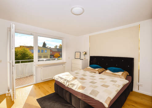 Das Obergeschoss beherbergt das Hauptschlafzimmer mit Zugang zum Balkon, zwei weitere Zimmer sowie ein modernes Bad mit Badewanne und Dusche.