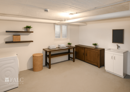 Der Keller bietet praktischen Stauraum, eine Waschküche und eine Sauna für entspannende Stunden.