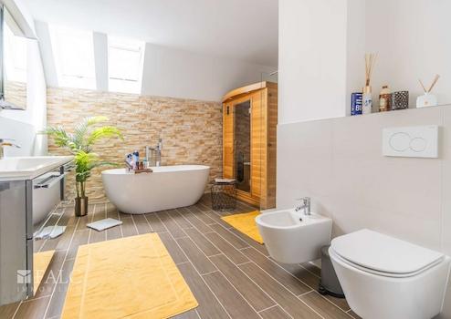 Im Obergeschoss erwarten Sie weitere durchdacht geschnittene Räume. Das großzügige Hauptschlafzimmer bietet direkten Zugang zu einem Balkon mit Blick in den idyllischen Innenhof. Zwei weitere Zimmer lassen sich flexibel als Kinder-, Arbeits- oder Ankleidezimmer nutzen. Das hochwertig ausgestattete Badezimmer überzeugt mit einer freistehenden Badewanne, modernen Armaturen und einer hauseigenen Sauna – ein Ort der Erholung und Entspannung.