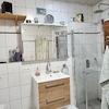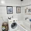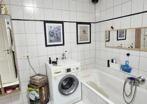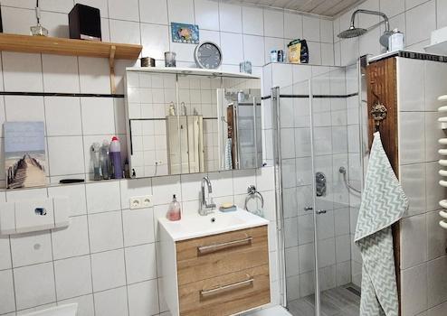 Das Badezimmer ist funktional gestaltet und mit einer Badewanne sowie einer separaten Dusche ausgestattet. Die hellen Fliesen verleihen dem Raum eine freundliche Atmosphäre.
