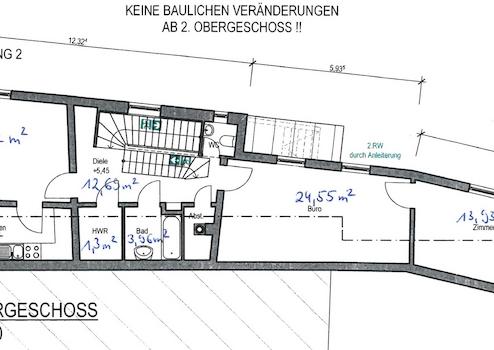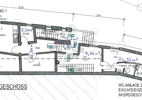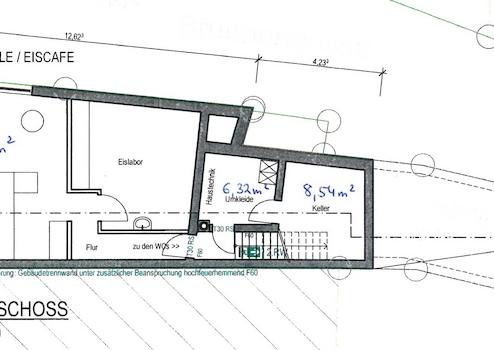 1.OG: Flur, 2 Lager + 3 WC ( für Eisdiele)