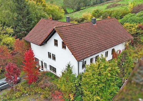 In absolut ruhiger und ländlicher Lage von Oberzent-Olfen präsentiert sich dieses außergewöhnlich große Einfamilienhaus mit rund 380 m² Wohn- und Nutzfläche auf einem liebevoll angelegten Grundstück in herrlicher Südwestlage – direkt am Feldrand und umgeben von Wiesen, alten Bäumen und üppigen Rhododendren.