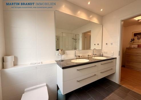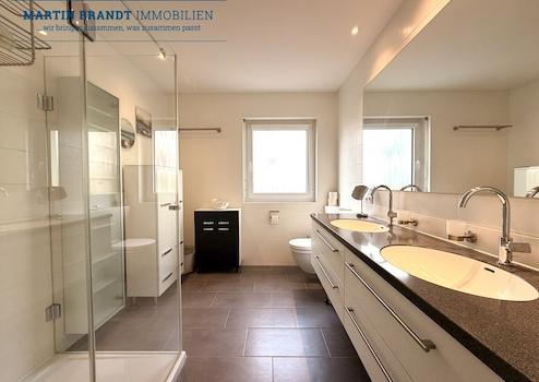 - Modernes Bad mit Fenster, bodenebene Dusche, Doppelwaschbecken, WC