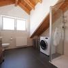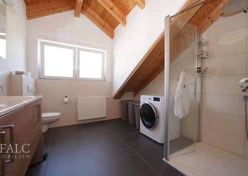 Rechts vom Eingangsbereich befinden sich die weiteren Räume der Wohnung. Das moderne Tageslichtbad in Holzoptik verfügt über Dusche, WC, Waschbecken sowie einem Waschmaschinenanschluss – ein echtes Plus im Alltag. Gegenüber befindet sich ein separates Gäste-WC, was insbesondere bei Besuch zusätzlichen Komfort bietet. Ein praktischer Abstellraum rundet den funktionalen Bereich ab und bietet Stauraum für Vorräte, Haushaltsgeräte oder Reinigungsmittel.