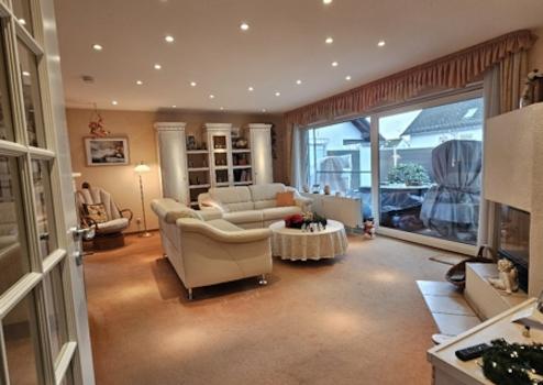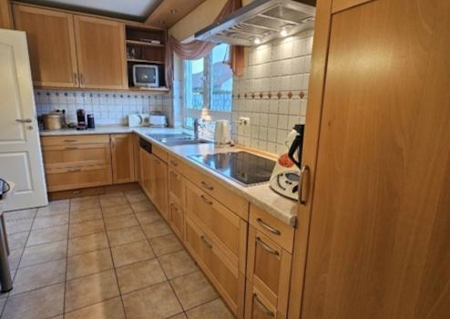 Erdgeschossig befindet sich eine top Wohnung mit Gäste-Wc, Küche, Esszimmer, Wohnzimmer, Bad, 2 kleineren und einem Hauptschlafzimmer. Die Wohnung verfügt über einen Kaminofen, Ebk und eine schöne Sonnenterrasse mit Übergang in den Garten. (ca. 115 m²)