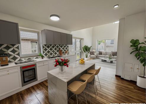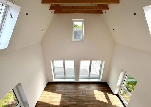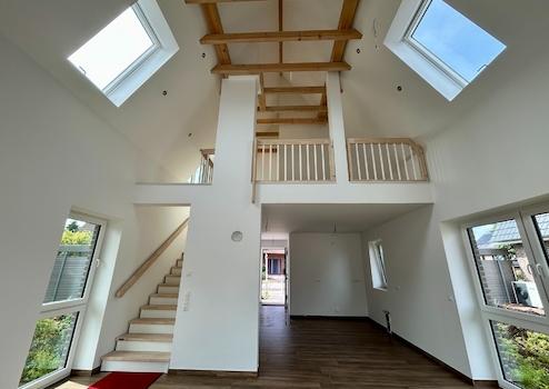 Im offenen Wohn,- Koch- und Essbereich des Erdgeschosses erwartet Sie ein besonderes Raumgefühl durch die großen Fensterfronten und den Luftraum mit Blick bis unters Dach.