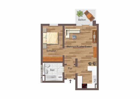Der helle Wohnbereich überzeugt durch seine offene Gestaltung: Die offene Küche fügt sich funktional in den Raum ein und ermöglicht kurze Wege beim täglichen Kochen. Von hier aus gelangen Sie auf den Balkon, der einen kleinen, aber gemütlichen Außenbereich bietet – ideal für den Morgenkaffee oder eine kurze Auszeit an der frischen Luft. Das Schlafzimmer ist gut proportioniert und lässt sich flexibel einrichten, sodass sowohl Stauraum als auch eine angenehme Schlafatmosphäre Platz finden.