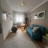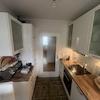 Die Küche nutzt den vorhandenen Raum optimal: Sie ist klein, aber effizient geschnitten, vollständig ausgestattet und verfügt über eine Waschmaschine. Eine gemütliche Sitzecke für zwei Personen macht den Raum besonders einladend. Wie für viele 60er-Jahre-Bauten typisch, sorgen große Fenster für viel Licht, während die Arbeitsfläche funktional gestaltet ist.