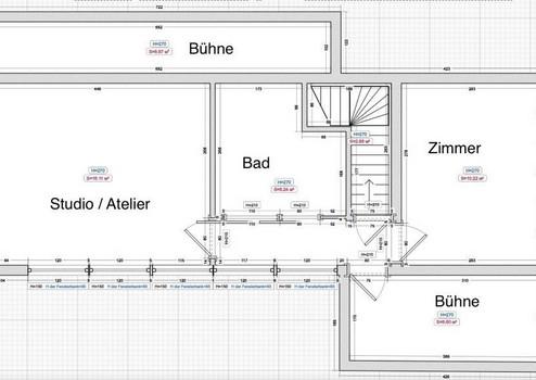 OG: Das Obergeschoss besteht aus einem Zimmer sowie einem Studio (Atelier) mit großer Raumhöhe mit weiteren Badezimmer.