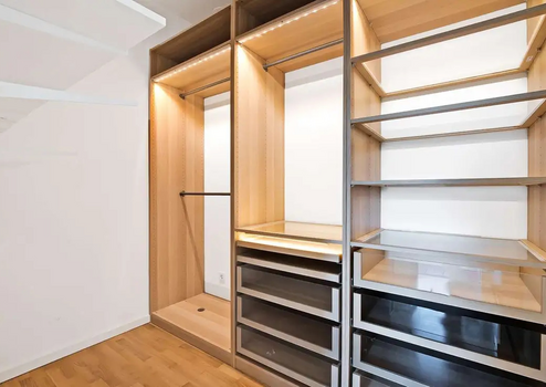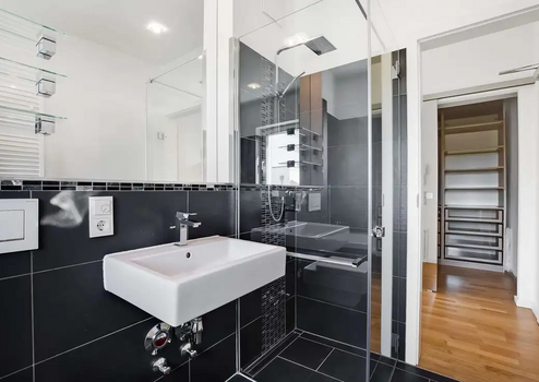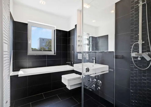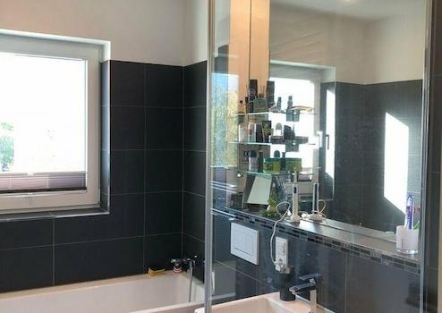 Das Badezimmer überzeugt mit einer hochwertigen Ausstattung, Dusche und Badewanne. Ein praktischer Einbauschrank sorgt für zusätzlichen Stauraum.