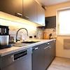 Linker Hand befindet sich die zeitlose Küche mit dunkelfarbenen Schränken. Die Küche ist mit den üblichen und gängigsten Küchengeräten ausgestattet (neu in 2023),
