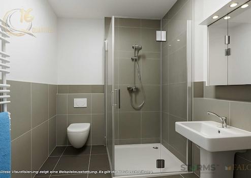 Das Badezimmer ist in der Planung mit einer bodengleichen Dusche vorgesehen. Die Sanitärausstattung wird modern und funktional ausgeführt.
