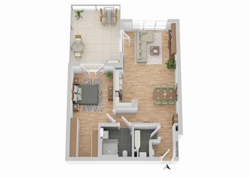 Ein besonderer Vorteil des Projekts ist die flexible Grundrissgestaltung, die – abhängig vom Baufortschritt – individuelle Anpassungen nach Absprache ermöglicht. Vom Wohnbereich aus ist ein direkter Zugang zum Balkon vorgesehen. Die geplante Fläche des Balkons beträgt ca. 20,40 m².