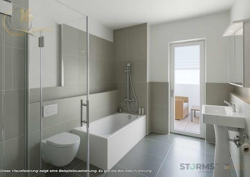 Das Badezimmer ist in der Planung mit einer Badewanne vorgesehen. Die Sanitärausstattung wird modern und funktional ausgeführt.