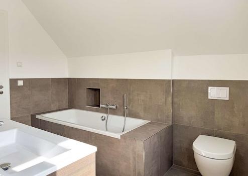 Über eine elegante Treppe gelangen Sie in das Obergeschoss. Hier befinden sich zwei helle Kinderzimmer sowie das Elternschlafzimmer mit begehbarer Ankleide. Das große Tageslichtbad ist mit einer bodengleichen Dusche und einer Badewanne ausgestattet – ein Ort zum Entspannen und Genießen.