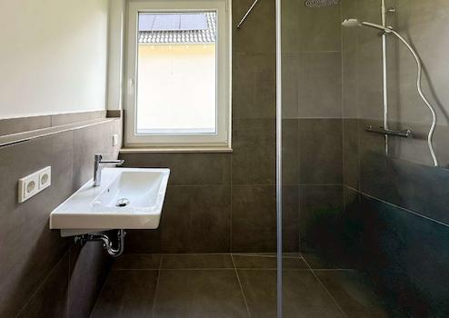 Beim Betreten des Hauses empfängt Sie ein zentraler Flur, von dem aus alle Räume im Erdgeschoss erreichbar sind. Auf der linken Seite befindet sich ein lichtdurchflutetes Zimmer, das sich ideal als Arbeits-, Gäste- oder Hobbyzimmer eignet. Rechtsseitig liegt der Hauswirtschaftsraum mit Anschluss für Waschmaschine und Trockner sowie der Haustechnik. Direkt daneben befindet sich ein modernes Tageslicht-Gästebad mit Dusche.