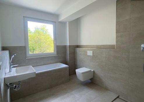 Hochwertige Sanitärausstattung, bodentiefe Dusche und Badewanne.
