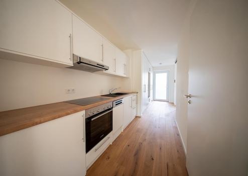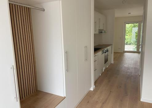 Die Wohnung ist mit einer Einbauküche und einem Einbauschrank im Eingangsbereich ausgestattet.