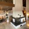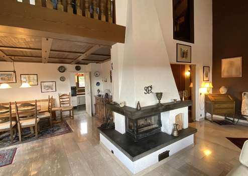 Im Mittelpunkt steht der großzügige Wohn- und Essbereich, der durch seine Offenheit und die weitläufigen Fensterfronten eine wunderbare Leichtigkeit ausstrahlt. Hier fällt das Licht großzügig ein, hier trifft das Leben zusammen. An kühleren Tagen schenkt der offene Kamin eine besondere Geborgenheit – ein Platz, an dem Gespräche länger dauern und Abende schöner werden. Von hier öffnet sich der Blick auf die große Sonnenterrasse und weiter in den grünen Garten, der mit seiner Weite fast wie ein kleines eigenes Naturrefugium wirkt.