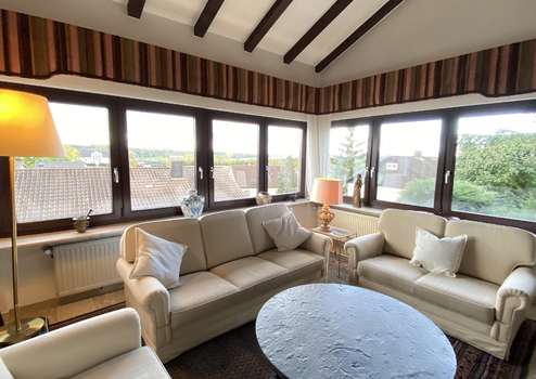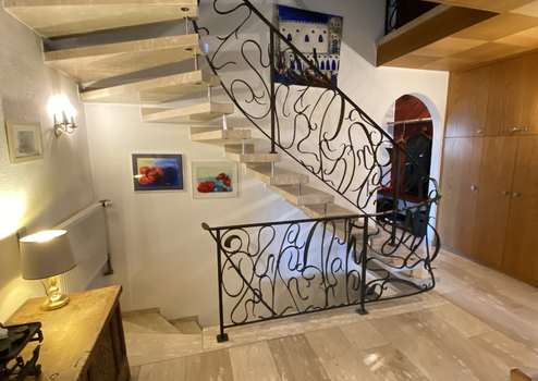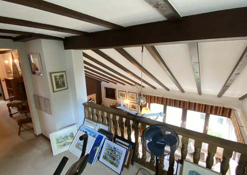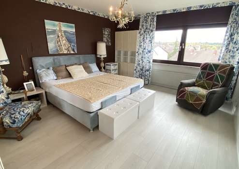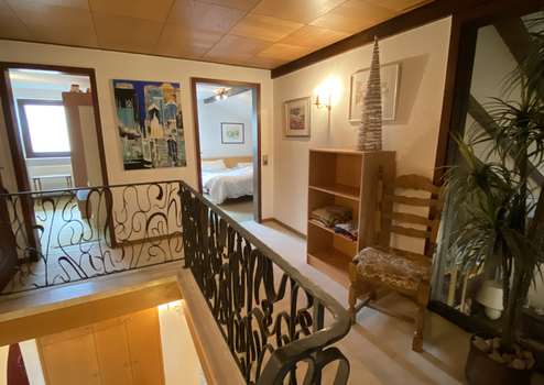 Die Küche – praktisch angebunden an den Hauswirtschaftsraum – fügt sich charmant in das Wohngefühl ein und bietet Raum für gemeinsames Kochen, Lachen und Genießen. Die stilvolle Galerie und das elegante Treppenhaus verleihen der Hauptwohnung eine besondere Architektur, die Offenheit und Struktur zugleich vermittelt. Fünf Zimmer bieten genügend Platz, um Leben, Arbeiten und Entspannen harmonisch miteinander zu verbinden. Das modernisierte Hauptbad rundet das Ganze mit einem Hauch von Luxus ab.