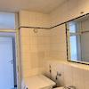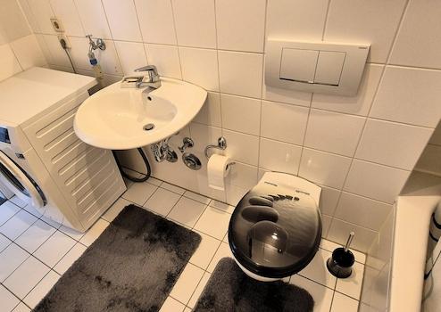 •Badezimmer: Ein innen liegendes Wannenbad, das zeitlos weiß gefliest ist.